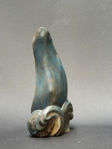 Stajcar, who works in bronze and stone, as well, says that this particular piece of burlwood — long, narrow, and tapered — spoke to her of ocean waves. As she sat with the wood, forms began to reveal themselves in its rippling burl patterns. She sketched them out first in pencil on paper and then directly onto the wood’s surface with chalk pencils. Gradually, she established the lines by which she’d carve. That sculpture debuted at the 20th annual Quest for the West Art Show and Sale at the Eiteljorg Museum in Indianapolis, Indiana.