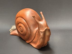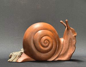 While many sculptures can be appreciated from all sides and angles, a careful walk around Seascapes offers rich rewards. On what appears to be the front of the sculpture, a bronze disc, patinated to a dusky gold like a setting sun, is inset into polished cedar swirls that evoke rolling waves, with their forms adding new meaning to the burl’s grain. “And then, on the other side,” says Stajcar, “I just followed along with the wood’s ‘waves’ and I put a little turtle at the narrow end.” That turtle is a delightful surprise and a poignant reminder of the need to maintain a fearless spirit amid nature’s immense powers.