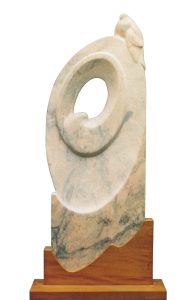 An additional excellent example is Dawn and Dusk. Starting with a vertical slab of rosy-hued marble more than 3 feet tall, the artist fashioned an elegant representation of the circle of life, with two doves perched on opposite ends of a gently curving central opening in the stone. The stone itself stands on an understated wooden base she designed and carved as an abstracted silhouette of a mountain range, giving the piece a monumental feel. Dawn and Dusk is one of the few sculptures she intentionally designed to be displayed against a wall, as she left its backside as a flat, unfinished rock. “For some reason, this just spoke to me that way.