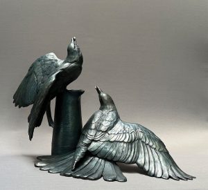 For example, Bird’s Eye View, another piece that debuted at the recent Quest for the West, appears to defy gravity despite its heavy medium — a single life-sized chickadee rests atop a long, graceful reed that gently bows under its weight. “You could just sculpt a bird and plop it on a base,” Stajcar states. “But design, flow, and balance matter to me.”