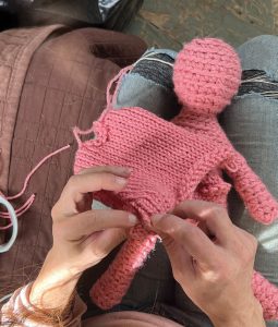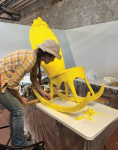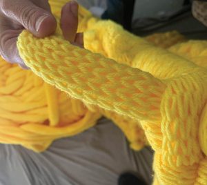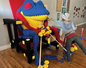 Odeile makes a final adjustment to FROG – A Fiber Situation, a monumental knitted sculpture about “frogging,” or unraveling a work in fiber.