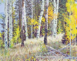 After getting sober, he started dedicating weeks at a time to trekking into Colorado’s backcountry, accompanied by llamas laden with painting gear and supplies; a ritual he continues to this day. On these plein-air painting trips, he brings small panels on which he writes affirmations, then paints over those words.