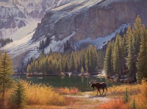 Jay Moore’s High in the San Juans, an outsized oil on linen that went for $29,000, depicts a lakeside moose that seems as struck by the mountain landscape as the observer and, certainly, the eye of the artist.