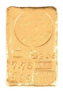 Gold crossed the bar to gain the number two slot, with a 2-inch-by-1-inch ingot from the so-called Felix Grundy Hoard — speaking to an assayer from Fiddletown in Amador County, California, an area in the heart of gold fields outside Sacramento. The bar sported Hoard’s stamp in a large circle with the legend, “No. 2206/7.75 OZS.’999 THOUS/FINE.”
