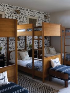 Rows of West Elm bunks with bespoke bedding invite comfort, with stools by The M Downtown and wall covering by Katie Kime.