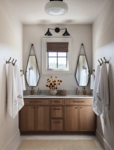 Anteriors Home mirrors highlight glamour in the girls’ suite powder room.