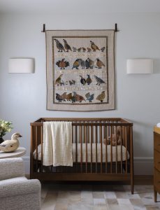 Crafted by Canadian Kallisti Quilts, this bespoke quilt reflects quail native to the ranch. A cowhide rug by Milagro Collective adds Western flair.