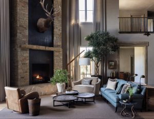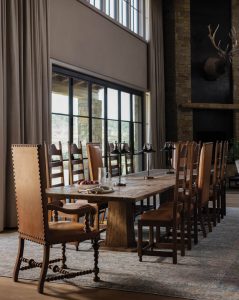 Phillips-Greco adds, “Many of the furnishings throughout the lodge are bespoke, antique, or adapted vintage pieces, sourced and modified specifically for the project. Nothing feels incidental. Every textile, lighting fixture, piece of furniture, and decorative object was selected to support the architecture rather than compete with it.” Centering on the owner’s favorite color, blue, the color palette is restrained, allowing texture, patina, and material to lead. The result is a home that feels settled, time-worn, and deeply personal, despite its scale.