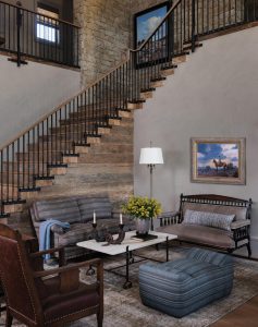Anchoring the family legacy, the iconic ranch brand was cast with steel into the circular drive. The gated entrance and long approach used the same limestone and steel motif, lit with custom handcrafted fixtures designed by Laughlin’s team. Nearly 1,000 feet of 8-foot-tall retaining walls seem to carve a pathway down to the river, while creating unique destinations along the way, anchoring the home into the hillside.