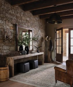 Custom quarried stone and lime plaster walls highlight the Brenden Bass reclaimed wood console and Peninsula Homes leather ottomans sit atop carpets by Loloi Rugs.