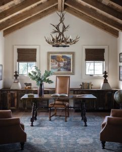 Professional Zen, this office is centered on an antique Spanish table and a carpet by Loloi Rugs.