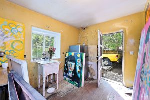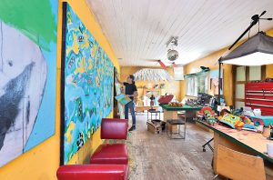 Well, he did tear out his kitchen, and sometimes paints there, too. Woodcarvings and grinding are done in the garage, off limits on this day. “It’s under a mountain of sawdust,” he explains.