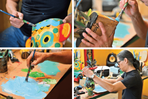 That’s what comes to mind in painter/woodcarver Gregory Lomayesva’s living room — aka studio — in the South Capitol neighborhood of Santa Fe, New Mexico. Even Lomayesva calls his routine chaotic, complete randomness. “You bounce around a bunch of things and suddenly it’s, ‘I’m going to do this.’ That, and massive amounts of coffee.”