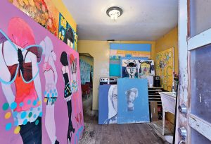Cupcake Girls, left, and other paintings are stored in “what’s supposed to be a kitchen, but it’s not yet.”
