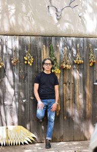 Lomayesva stands in front of the doors to the studio, with a smaller version of Wings at his feet and flowers drying out behind him. “I love flowers,” he says.
