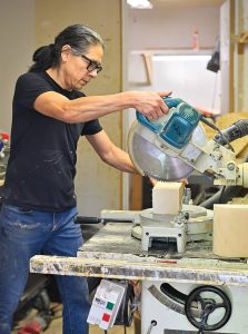 At work with a table saw in his woodworking shop, aka the garage, where “all the other goodies are.”