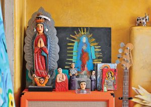 The room’s certainly colorful, about 25 by 14 feet in a 1940s house of roughly 1,625 square feet. Paintings and wooden carvings fill the space along with a collection of artwork from Lomayesva’s mother, renowned santera Marie Romero Cash. Acrylic paint is everywhere, including spots on the hardwood floors, even surrounding the “highbrow electronic stuff” he bought for his musical career (he plays keyboards). “I didn’t have the money to buy a vacuum tube to record like the Beatles, the good stuff,” he says, so he taught himself, funding that obsession with sales from his artwork.