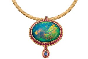 Master jeweler and goldsmith Larry Vasquez relies on his Aztec/Mayan/Mescalero Apache heritage to guide his work with “his allies,” precious metals and brilliant gems. Inspired by ancient stories and myths, every creation, imbued with spirit, comes with a poem, sprung from his own heart. In Mirroring Mirror, a 65-carat black Lightning Ridge Australian opal glows amidst 78 Chatham rubies and one Chatham blue pear sapphire, elegantly hung off an 18K yellow gold basketweave neck piece. Vasquez is represented by fine galleries in New Mexico and Arizona and available by appointment at Santa Fe’s annual Indian Market.