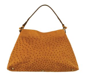 This chic shoulder bag created in full quill ostrich leather can be worn anywhere, elegant in simplicity and classic in style. Made by the master himself, handbags by Juan Antonio Cerillo have timeless appeal, and are built with care and sensitivity to scale, comfort and functionality. Finished in a buttery saddle tan, the strap and knots are handwoven leather in dark espresso brown, with woven rondelles and knots in a lighter shade of sand. Antique brass feet protect the bottom and a hidden magnetic snap closure provides security. The roomy interior offers a zippered wall pocket and two slip pockets.
