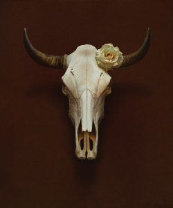 Sherry Johnson’s recent paintings of sun-bleached skulls adorned with vibrantly colored flowers — a series she calls “Bones & Blossoms Collection,” epitomized in the painting Santa Fe Bull — breathe new life into the centuries-old artistic genre known as memento mori, literally “remember death.” But instead of focusing on dark thoughts about the fleeting nature of our existence, her realist oils favor life-affirming messages. She says, “I’m hoping these paintings remind people that, though all things will eventually fade away, we should live full lives in the here and now.”