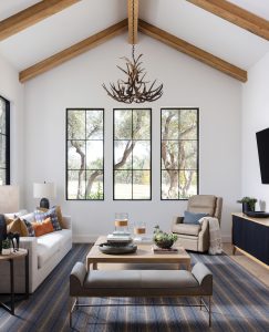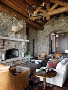 The great room features a two-tiered Launceston Grande chandelier in bronze by Chapman & Myers, from Visual Comfort. Jamestown swivel chairs from Wesley Hall and an Arden Ottoman from Cisco Home add a comfy feel to the old-world feeling created with stone and wood.