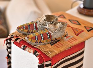 Authentic artifacts aid in the artist’s historically accurate paintings. Here, Plains Indian moccasins are perched on a rare woven cornhusk bag atop an early-19th century Diné young women’s wearing blanket.