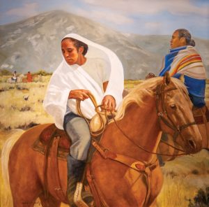 A Day in Taos, a 30 x 30-inch oil featuring Dwight Concha of the Taos Pueblo, on horseback with iconic Taos Mountain behind. Photo: Phil Velasquez