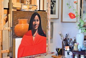 The challenge was that Santiago was not allowed to take photos; she had to paint the model entirely from life that day. She says that because of Jacob, whom she calls an ‘art hero,’ she was forced to push her boundaries and break out of her comfort zone. “Painting Tony that day was a euphoric experience. The beautiful color of his suntanned skin against the traditional regalia inspired me. After that, I went to Feast Day at San Felipe. Once you see 200 dancers dancing for five hours, you realize that the beauty of living history is not a movie; it’s right in front of you.”