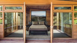 The primary bedroom and balcony are united with the outdoors by a cypress window wall and siding that open onto a private covered porch.