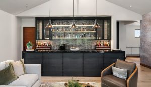 Bifold glass doors open to views of the fairway. Inside, the great room bar made of Mustang quartzite is illuminated by Gossamer fixtures and an LED pendant.