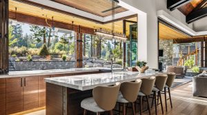 Stunning Douglas fir double arches by Ryan Construction Services support the great room ceiling, where walnut tongue and groove highlights its expansiveness. The space features custom kitchen cabinets by Craft Cabinetry and bifold glass windows designed by Sierra Pacific Windows.
