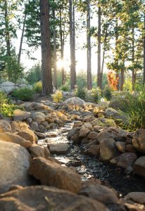 Flowing under the bridge connecting the home’s two main structures, a water feature created by Reno Green Landscaping flows into a large pond for soothing ambient sound. Floor-to-ceiling windows by Sierra Pacific offer views in both directions.