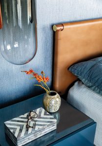 The primary bedroom is a play of angles and geometry. Elements that foster the effect include a bouclé bed by Arhaus, a walnut desk fashioned by Luke Bartels, green glass pendants by L’Aviva, and a wall that is upholstered in leather.