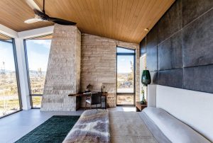 Upwall recognizes that one of the most fundamental aspects of being an artist is that creativity loves constraints. In this case, he needed to design a house for a family of four that would express their sense of adventure; celebrate the valley views without obstructing those vistas for others; and incorporate bold designs that could actually be realized. Hill, who has collaborated with Upwall on other building projects, says, “The home has a stately feel, with the stone mass of the structure creating a shelter, and thin glass panels creating a conditioned space from the outside. By using this method of architecture, the exterior stone becomes the interior stone and vice versa.”