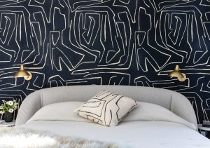 For one of the bedrooms, Kelly Wearstler’s “Graffito” wallpaper and matching pillow are used to back a bed from CB2.