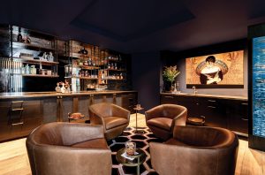 The home’s moody and cozy bar room is furnished with four leather swivel chairs by Arhaus, set on a custom hide rug designed by Kyle Bunting.