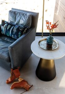 A Lee Industries recliner is set beside a marble and brass table by Four Hands.