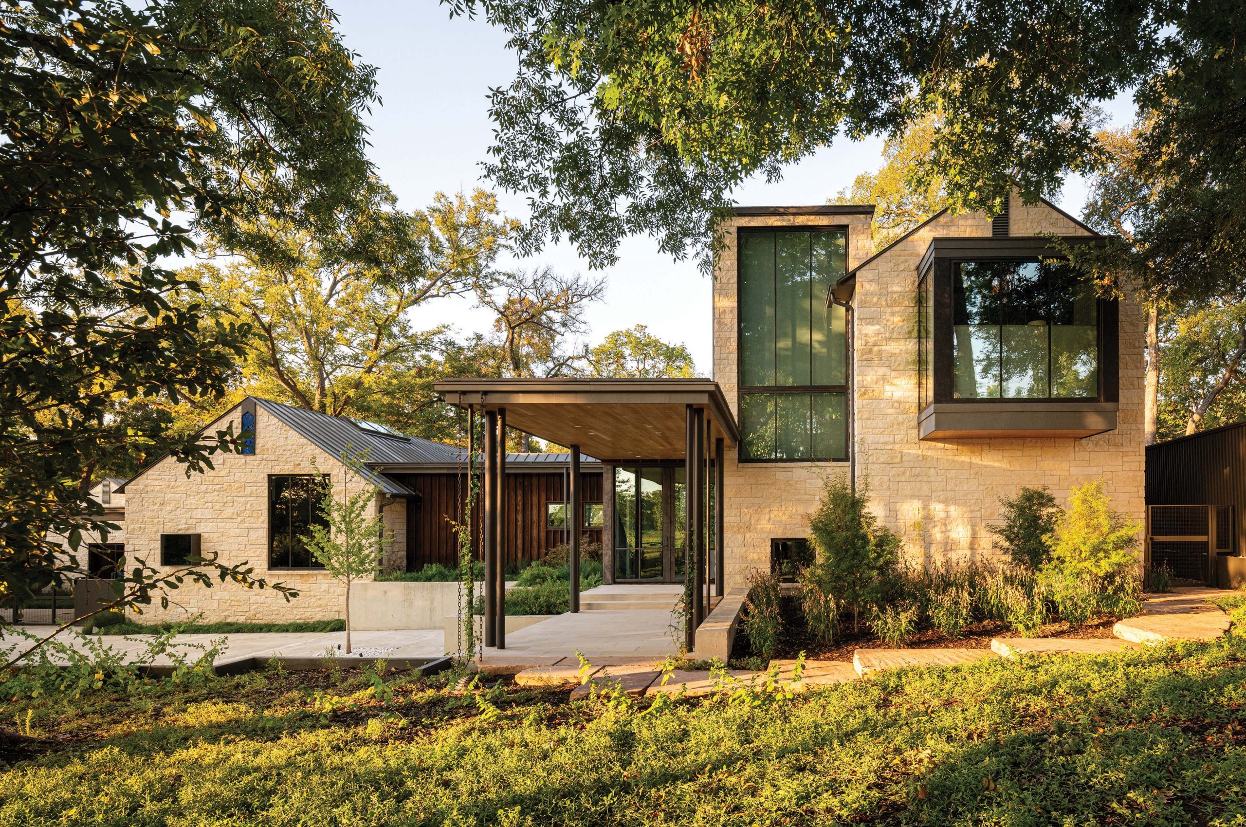The landscape was designed by Paper Kites Studio in Dallas to incorporate heritage trees, native grasses and perennial plantings.
