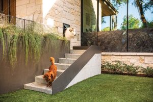 Archie, the couple’s long-haired Dachshund and Pippin, their Borzoi (Russian Wolfhound) delight in both the indoor and outdoor spaces designed for them.