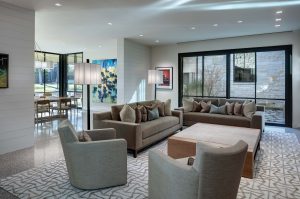 In addition to wanting an urban ranch, the couple’s needs were specific: their three dogs—an Afghan hound, a Borzoi, and a miniature long-haired dachshund — must be at the heart of their home, just as they are the heart of the family. “Everything about them shaped the design of our home. We wanted them to have room to run and explore, but at the same time we wanted to be able to train and care for them in designated spaces,” she says of the pups who participate on the show circuit and K9 Nose Work. Her husband appreciates the usefulness of every space in the 7,600-square-foot residence which — in addition to the elegant residential spaces — includes a gym plus a grooming room, small kennel, a training room for the dogs, and four garage spaces with workshop space for DIY projects.