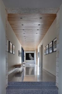 Like all his designs, Tibbs relied on a restrained palette of materials for the Winstead home. Rough Texas limestone, white oak, and a metal roof define the exterior, while terrazzo floors, stunning millwork and glass walls make the inside come alive with all the natural light. The home is across the street from a park, and not far from White Rock Lake, so Tibbs curated the views from the front of the house and opened the back entirely with walls of glass. Internally, there is a single axis that drives through the building with an outsized horse painting by Joe Andoe at one end and the dog facilities at the other. “The things they love most bookend the house,” explains Tibbs, “and everything in between is where life happens.”