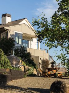 An Arterra-designed picnic area with a massive pizza oven borders the rear of the new addition. The dining area features a picnic table that seats 20. Gravel matches the home’s stone cladding.